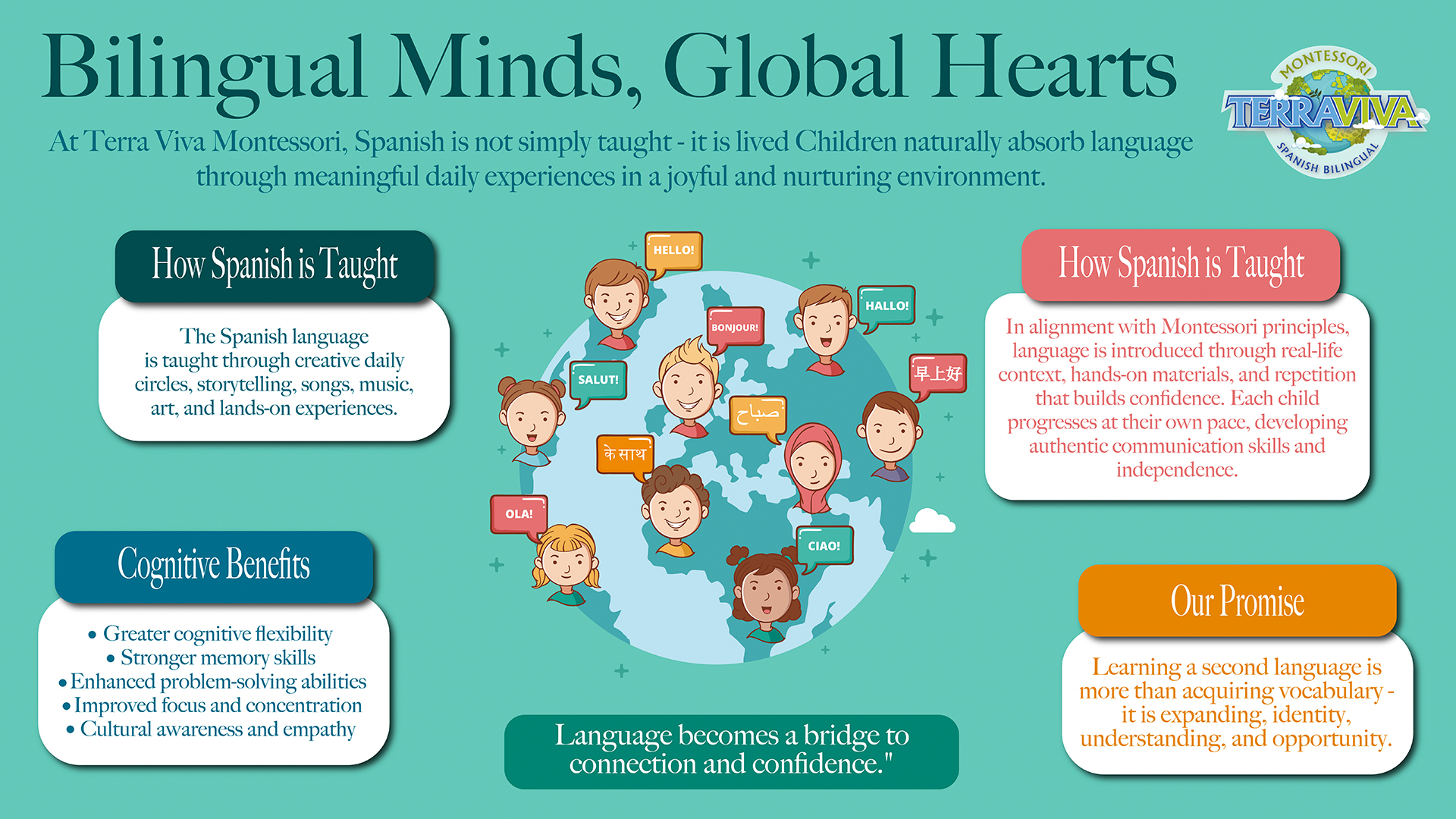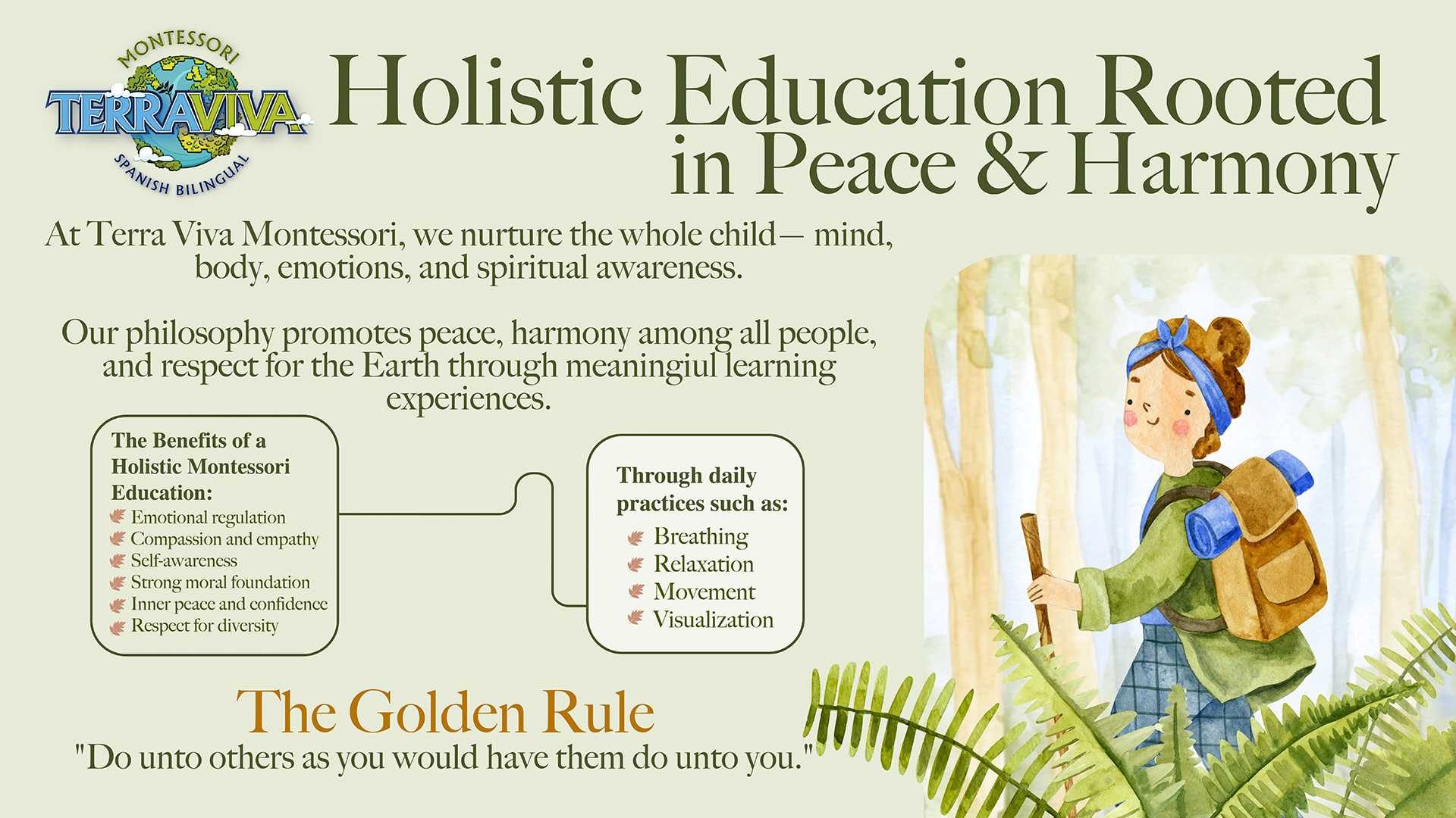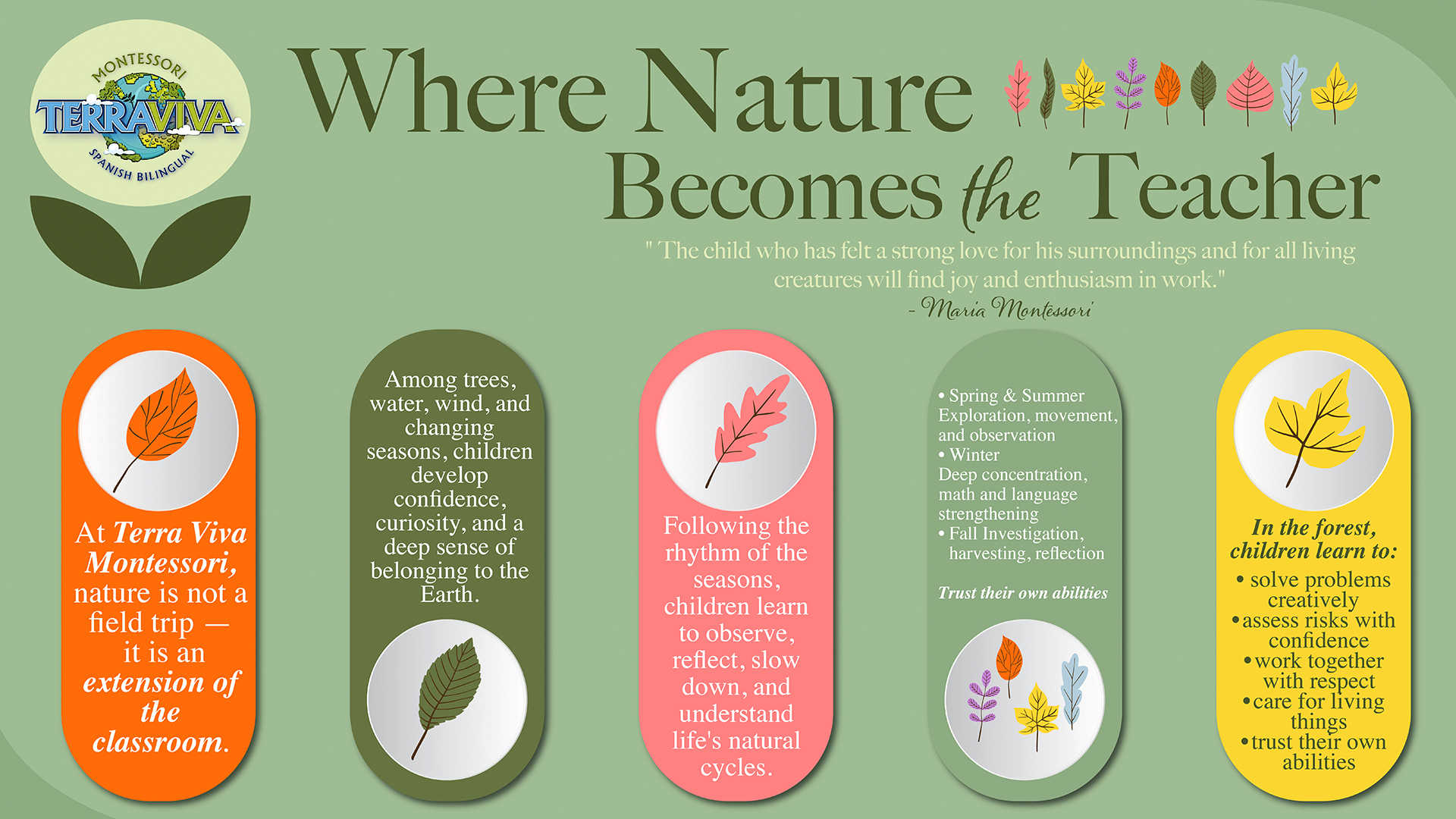 Our unique blended Montessori and Nature philosophy makes our learning style -one of a kind-. Terra Viva is proud to offer a holistic program that exposes children to nature, the Spanish Language and to the amazing benefits of the Montessori Education established by a pioneer in her field, Dr. Maria Montessori.